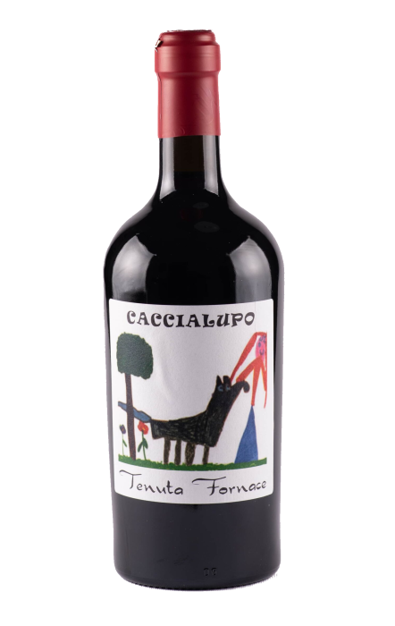 De naam Caccialupo (wolvenjacht) verwijst naar het gelijknamige gehucht waar ooit een gevaarlijke wolf door de bewoners werd gevangen. Dochter Alice was zo onder de indruk van dit verhaal dat zij dit tafereel heeft getekend. Door vader Andrea werd deze tekening gebruikt als etiket.